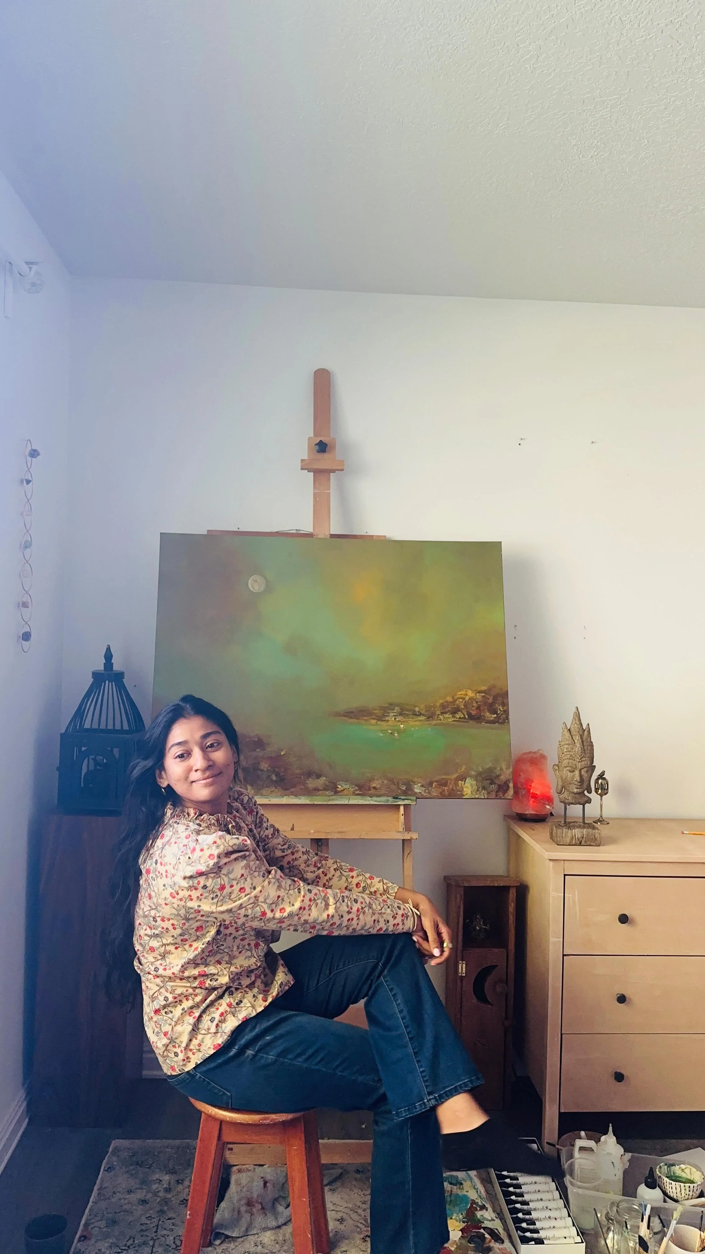Shangari, based in the Midwest USA. My work is influenced by Monet’s softness and Van Gogh’s emotion, but what leads me is curiosity, intuition, and the search for peace. I often paint skies that don’t exist, moons that feel familiar, and dreamlike spaces where feeling becomes form.